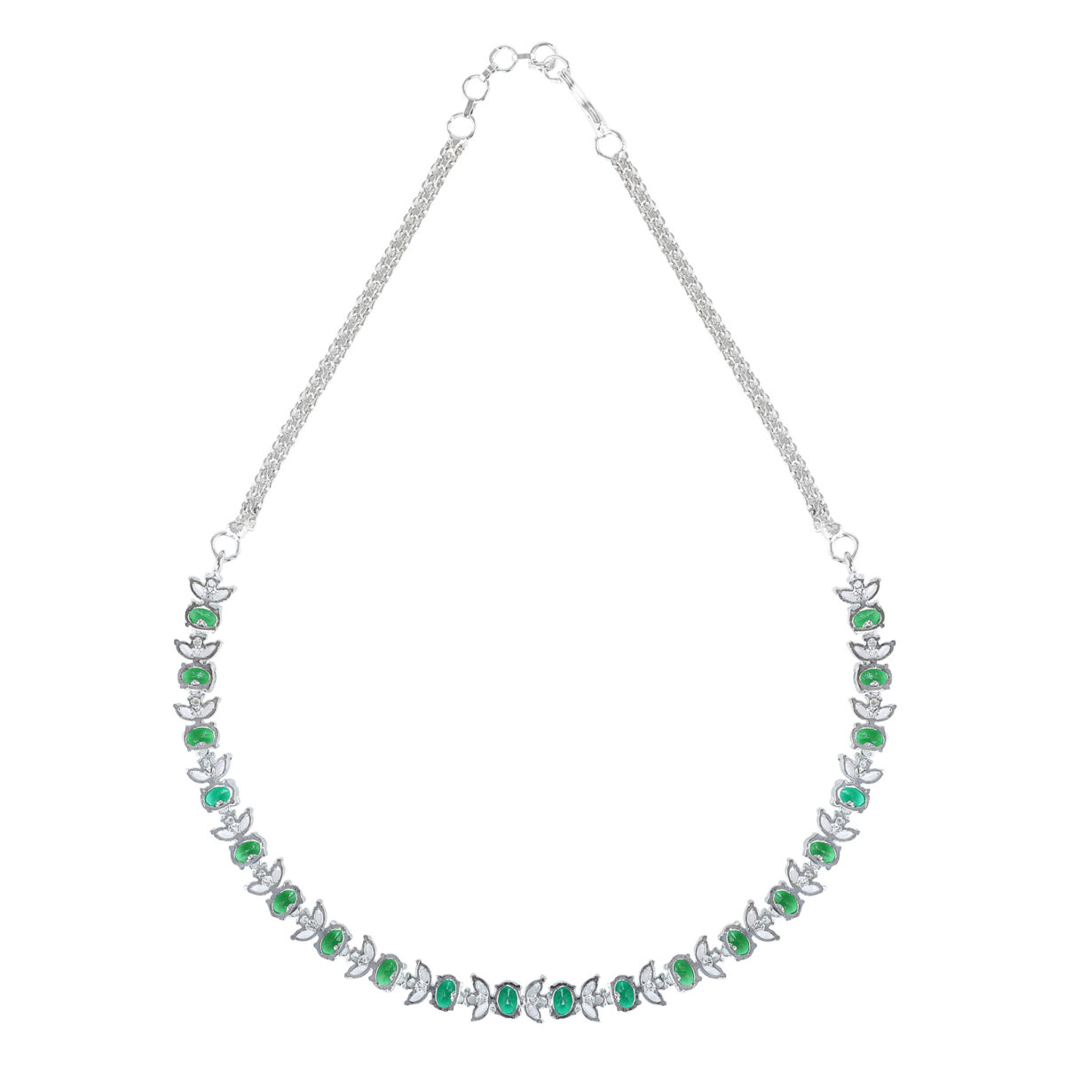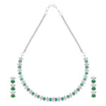 A beautiful necklace set featuring a silver-toned chain adorned with alternating green and clear stones. The stones are oval-shaped, and the necklace has a design that resembles leaves or stylized floral patterns. Matching earrings complete the set.