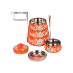 The traditional Indian design not only adds aesthetic charm but also provides practical benefits with its stackable, space-saving containers and sturdy top handle for convenient carrying.