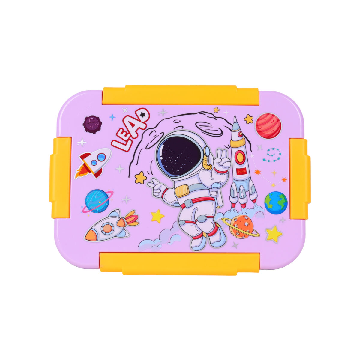 Make lunchtime a cosmic adventure with our Kids Stainless Steel Lunch Box featuring a playful space astronaut theme! Designed to combine fun with function, this lunchbox is perfect for school-going children. The vibrant purple lid showcases colorful rockets, planets, and a cheerful astronaut that your child will absolutely love.
