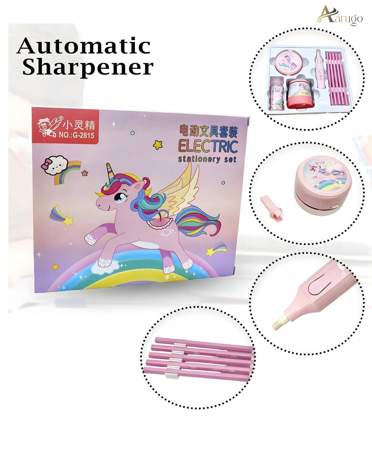 Contents Electric sharpener, 5 pencils, pen eraser + refills, unicorn mini vacuum