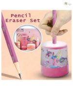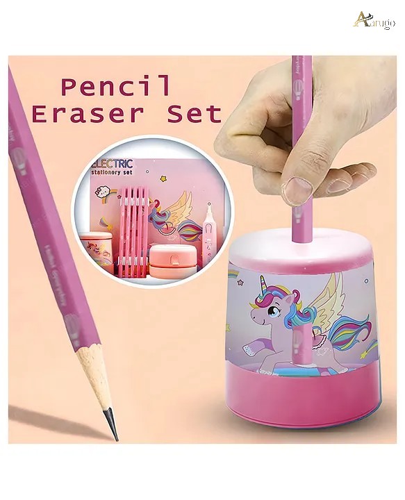 All-in-One Kit: Includes USB-powered electric pencil sharpener, pen-style eraser with extra refills, five pastel “kawaii” pencils, and a cute desk vacuum cleaner modeled like a unicorn.